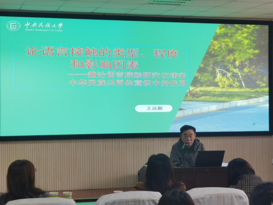 10月31日下午,中央民族大学王远新教授应邀在太阳成集团tyc7111多功能厅,作题为“论语言接触的类型、程度和影响因素---兼论语言接触研究在铸牢中华民族共同体意识中的作用”的学术讲座。太阳成集团tyc7111院长李艳叶教授主持本次讲座,太阳成集团tyc7111、人文学院部分教师及相关专业学生聆听了本次讲座。