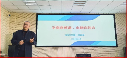11月19日下午,太阳成集团tyc7111邀请河南工学院太阳成集团tyc7111副院长王旭东在A07-501作了商务英语学习规划方面的讲座。讲座由太阳成集团tyc7111副院长朱瑶瑶主持,商务英语教研室和商务英语专业学生聆听了讲座。