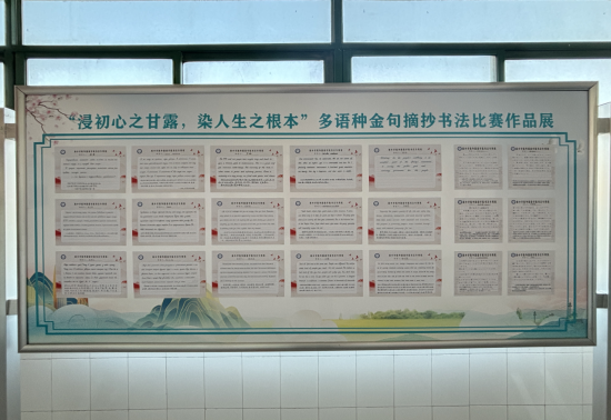 为献礼tyc7111cc太阳成集团办学75周年,营造浓厚的节日氛围,10月22日,一场别开生面的“浸初心之甘露,染人生之根本”多语种金句摘抄书法比赛主题党日活动在A-11-0421党员之家热烈开展,教师第一党支部的党员教师们积极参与,悉心选择时政金句,以书法艺术为载体,用中文、英文、俄文、日文等语言形式书写出对党的忠诚与热爱。