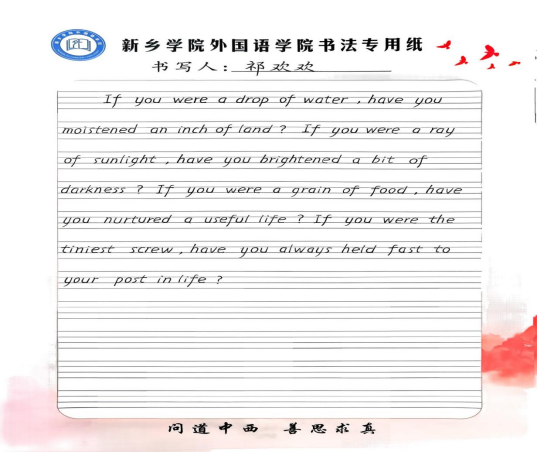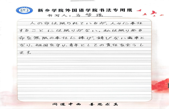 活动以雷锋精神金句摘抄为核心载体,将思想政治教育与专业实践深度结合,鼓励学生以双语形式书写雷锋经典名言。活动中,同学们静心品读雷锋同志的经典语录,一笔一画认真摘抄,一字一句深刻感悟,在沉浸式学习中领会“奉献、友爱、互助、进步”的志愿精神内涵,理解雷锋精神的时代价值。活动将雷锋精神学习融入日常、抓在经常,有效营造了“人人学雷锋、处处践初心”的浓厚校园氛围,让雷锋精神在跨语言表达中焕发新活力,展现了青年学子坚定的理想信念、勇担时代使命的精神风貌。