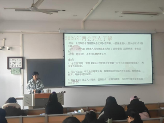 班会中辅导员重点解读了国家“十五五”规划、2026年全国两会精神与新质生产力发展要求,从学院自身情况出发,结合学院赴辉县市农村的志愿服务实践,明确外语人在科技自强、文化传播中的核心价值,强调语言不仅是交流工具,更是大国博弈中的“软装备”,引导学生从“小我”走向“大我”,以“筑牢根基、拓展视野、讲好故事、扎根实践”为方向,成长为“语言能力+专业素养”的复合型人才,在讲好中国故事、服务国家发展中书写青春答卷。班会中,各位辅导员老师还强调青年学生要自觉加强理论学习,提高思想觉悟,将个人成长与国家发展、社会需要紧密结合,以昂扬向上的精神状态面对学习与生活,争做有理想、敢担当、能吃苦、肯奋斗的新时代好青年。