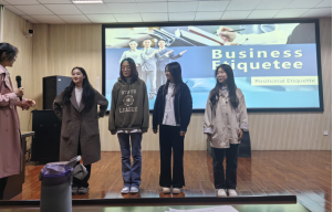 活动第二站—“商务礼仪双语讲”,学生分成小组对商务礼仪不同方面进行讲述介绍,如商务电话礼仪﹑着装礼仪﹑会面礼仪﹑就餐礼仪等。除了常规的PPT形式,更是生动形象得以情景剧的方式进行演绎,学生们做了充分的准备,形式多样,内容丰富。