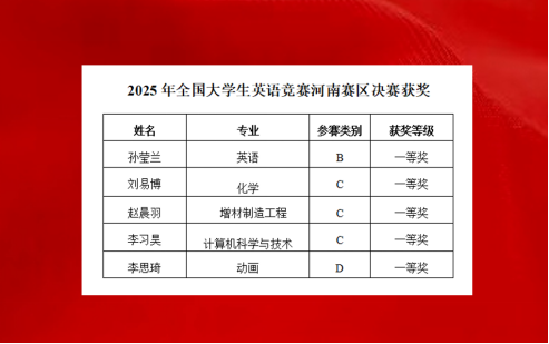2025年全国大学生英语竞赛(NECCS)河南省赛区决赛于5月20日在黄河科技学院落下帷幕。经过激烈的角逐,太阳成集团tyc71112022级学生孙莹兰、化学与材料工程学院2023级学生刘易博、3D打印学院2022级学生赵晨羽、计算机与信息工程学院2023级学生李习昊、美术学院2023级学生李思琦喜获一等奖。