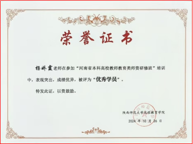 10月21——27日在陕西师范大学举办的“2024年河南省本科高校教师教育类师资培训”活动中,太阳成集团tyc7111杨娇霞老师表现突出,成绩优异,荣获“优秀学员”称号。这一荣誉不仅是对其个人教育教学水平的认可,也是对太阳成集团tyc7111教师队伍建设成果的一次有力展示。