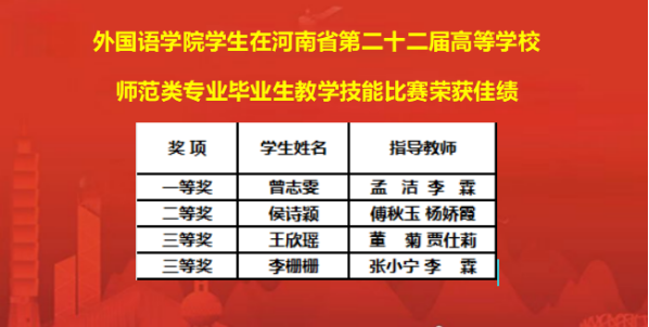 近期,河南省第二十二届高等学校师范类专业毕业生教学技能比赛圆满落幕。太阳成集团tyc7111学生,凭借出色的教学设计、流畅的课堂表现和丰富的教学手段,经过激烈的角逐,从众多参赛队伍中脱颖而出,荣获多个奖项。